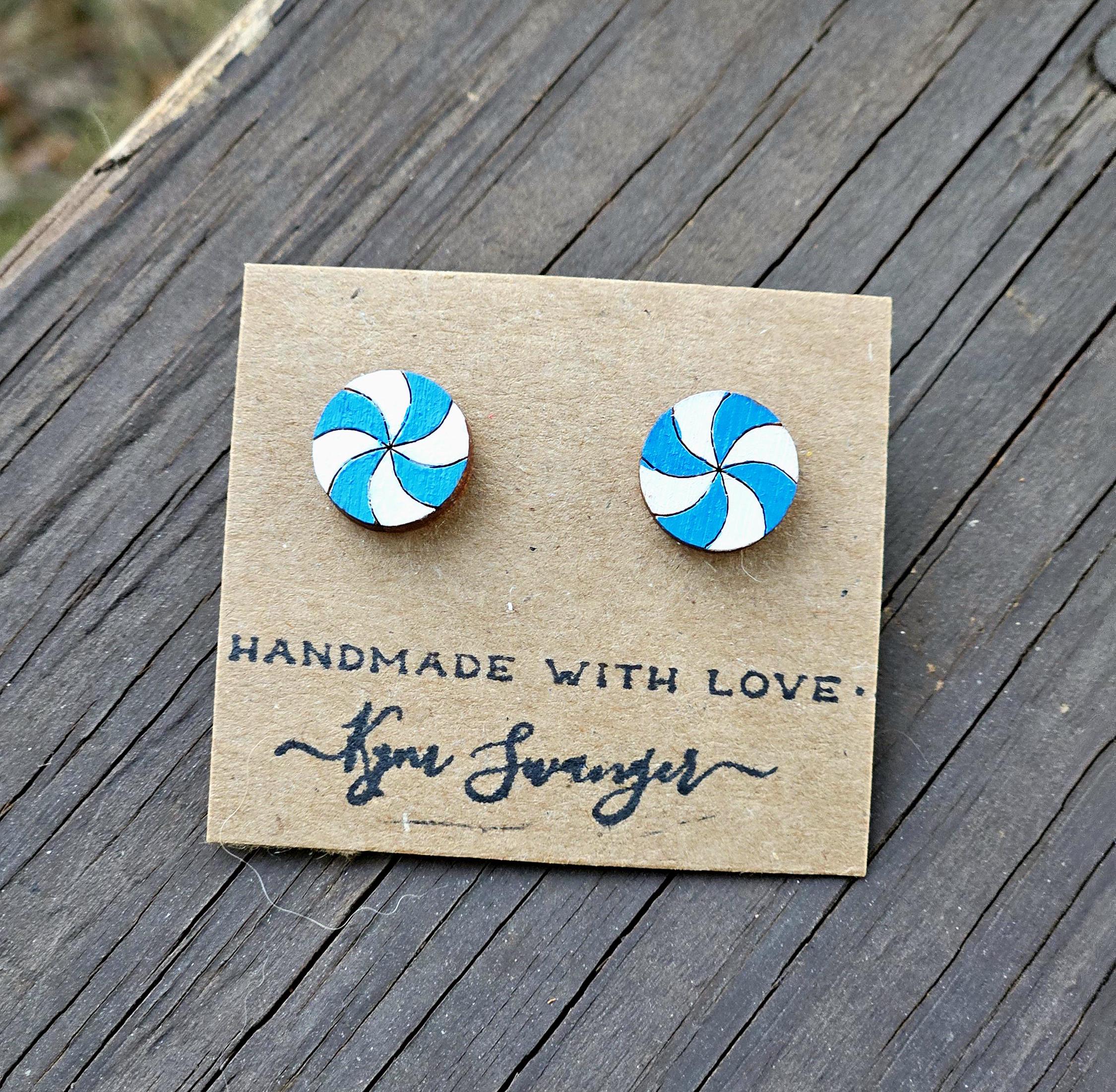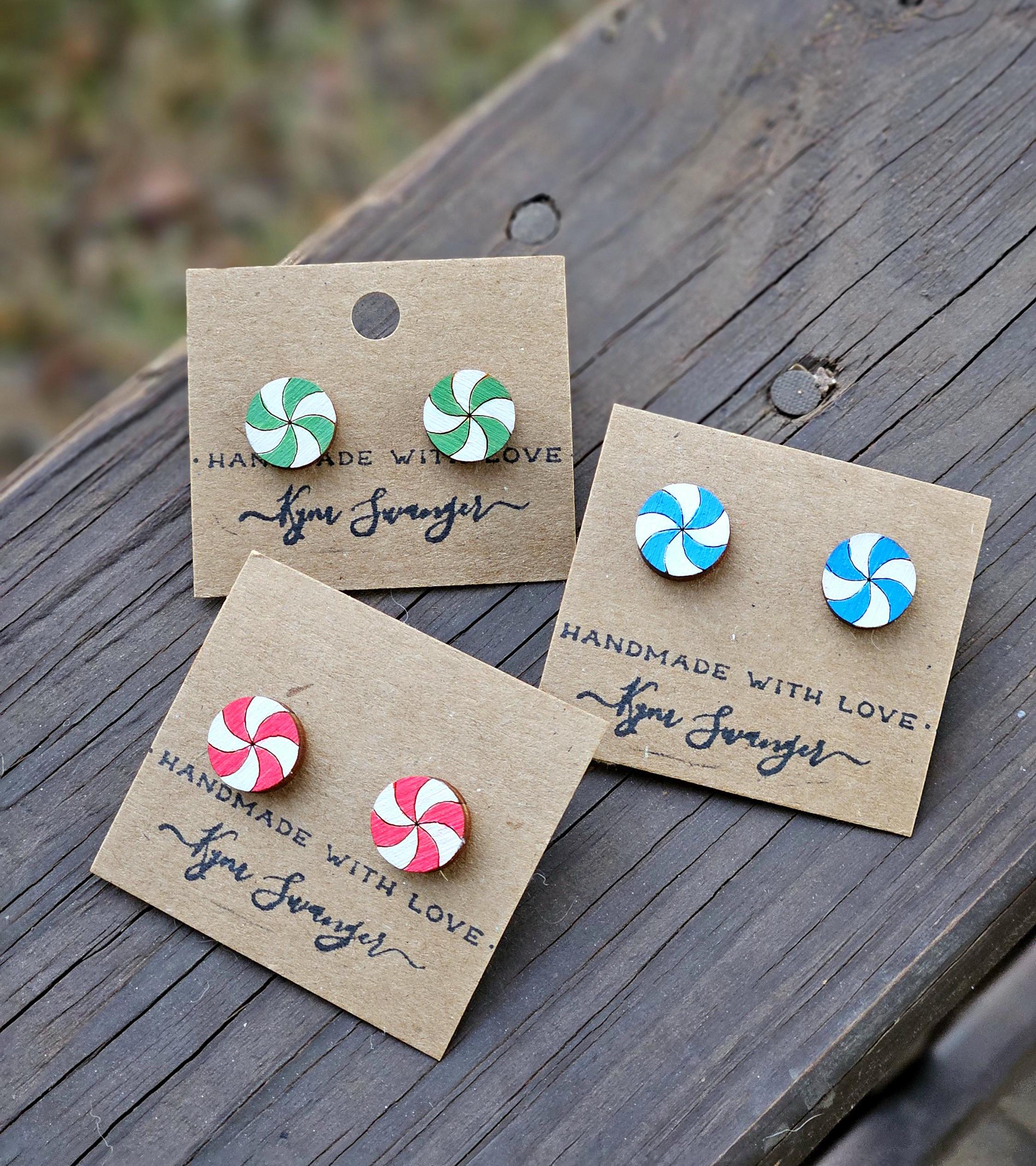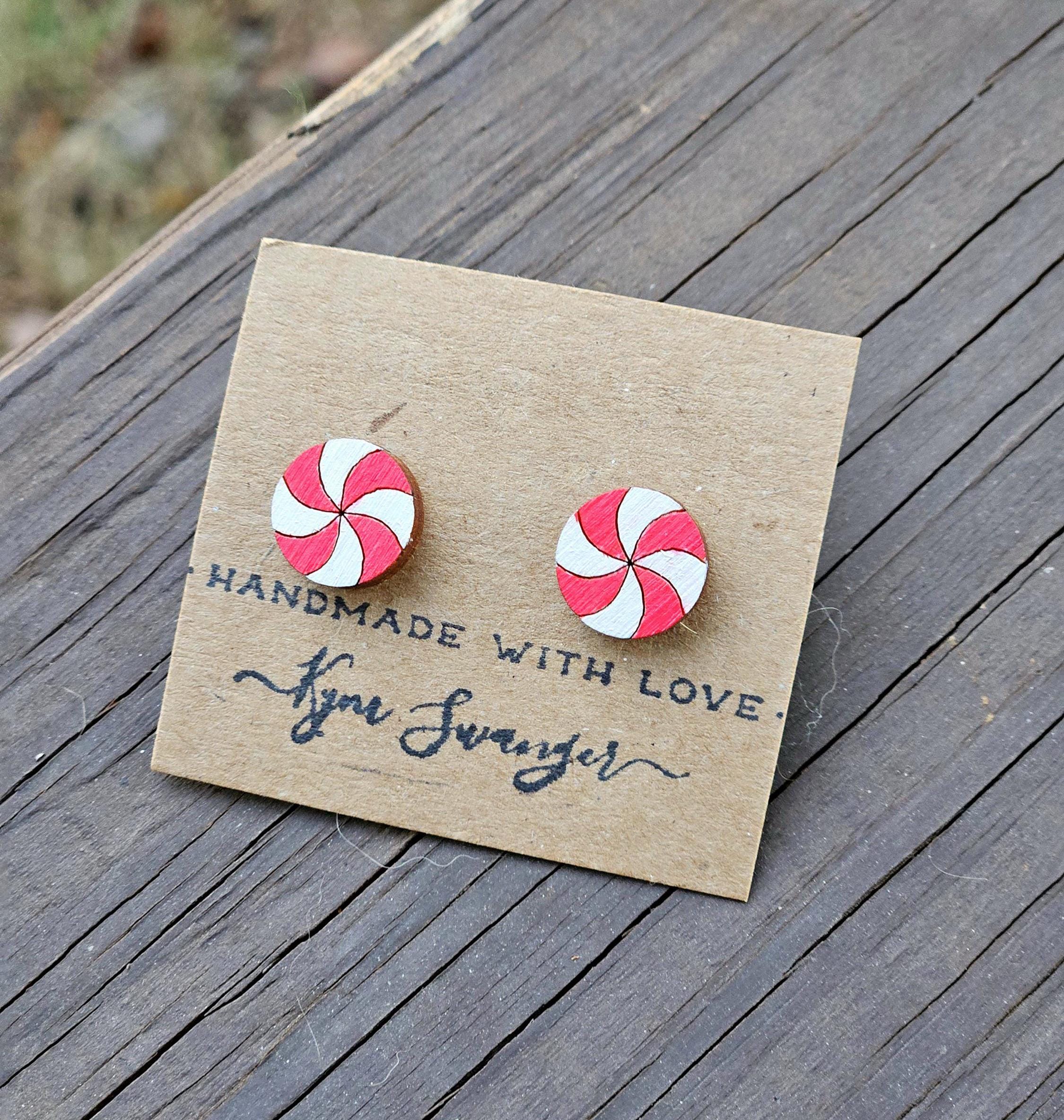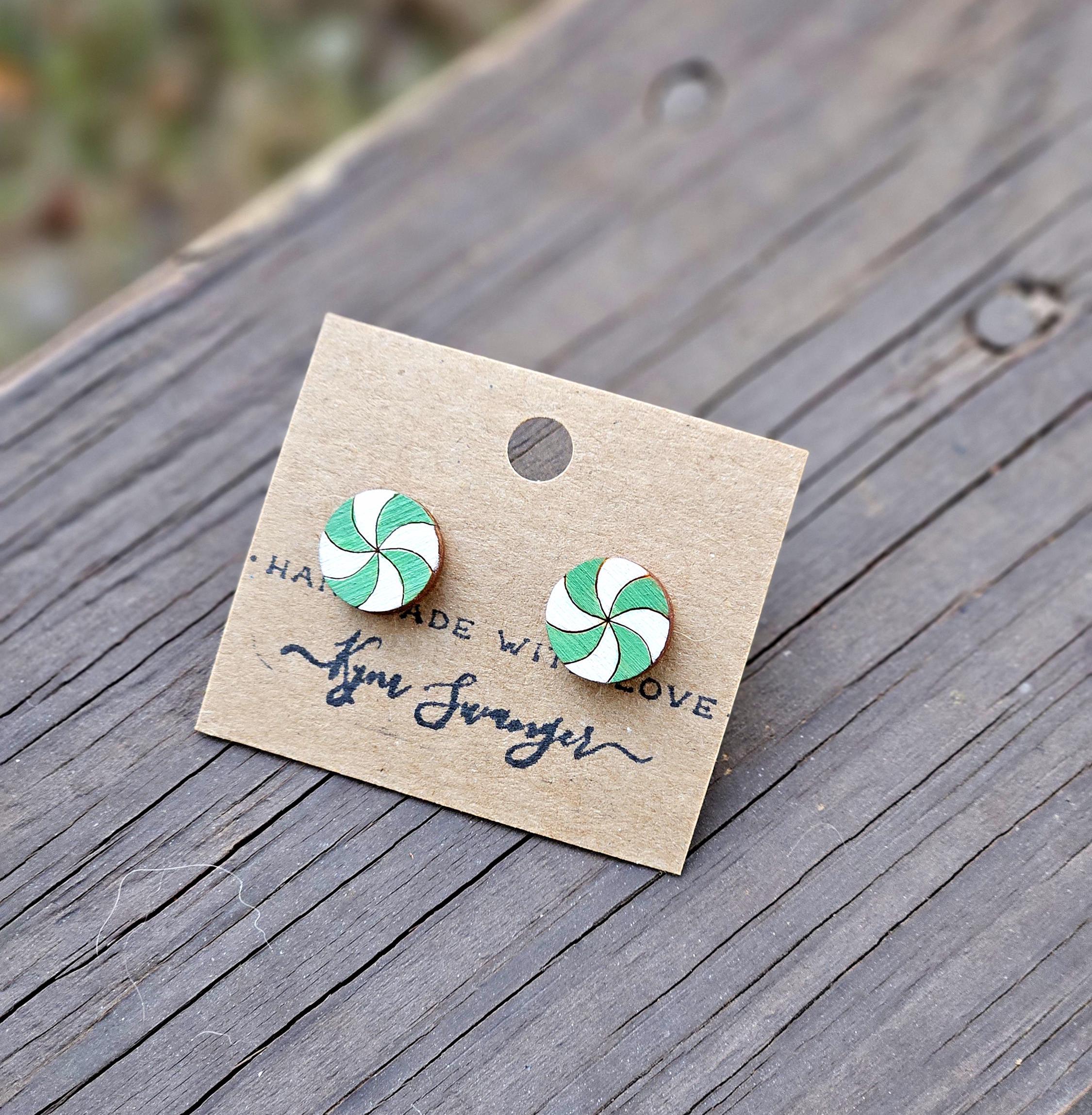 Add a dash of holiday cheer to your jewelry collection with these hand-painted peppermint wood stud earrings! Each pair features a delightful peppermint swirl design, available in your choice of red, blue, or green for a fun and festive look.