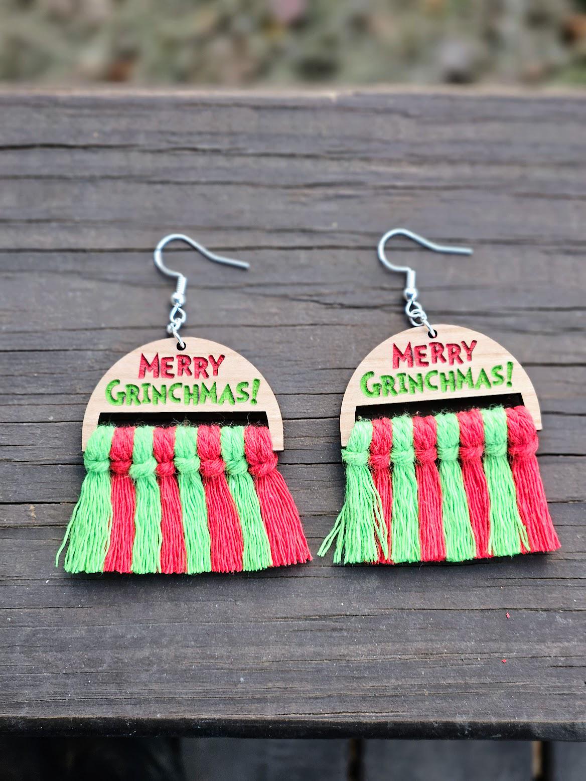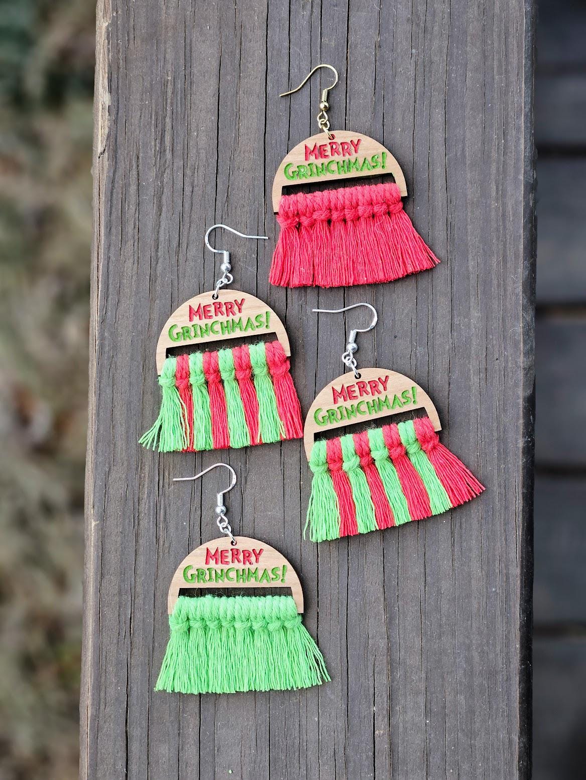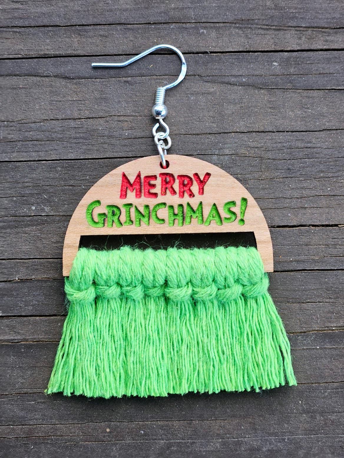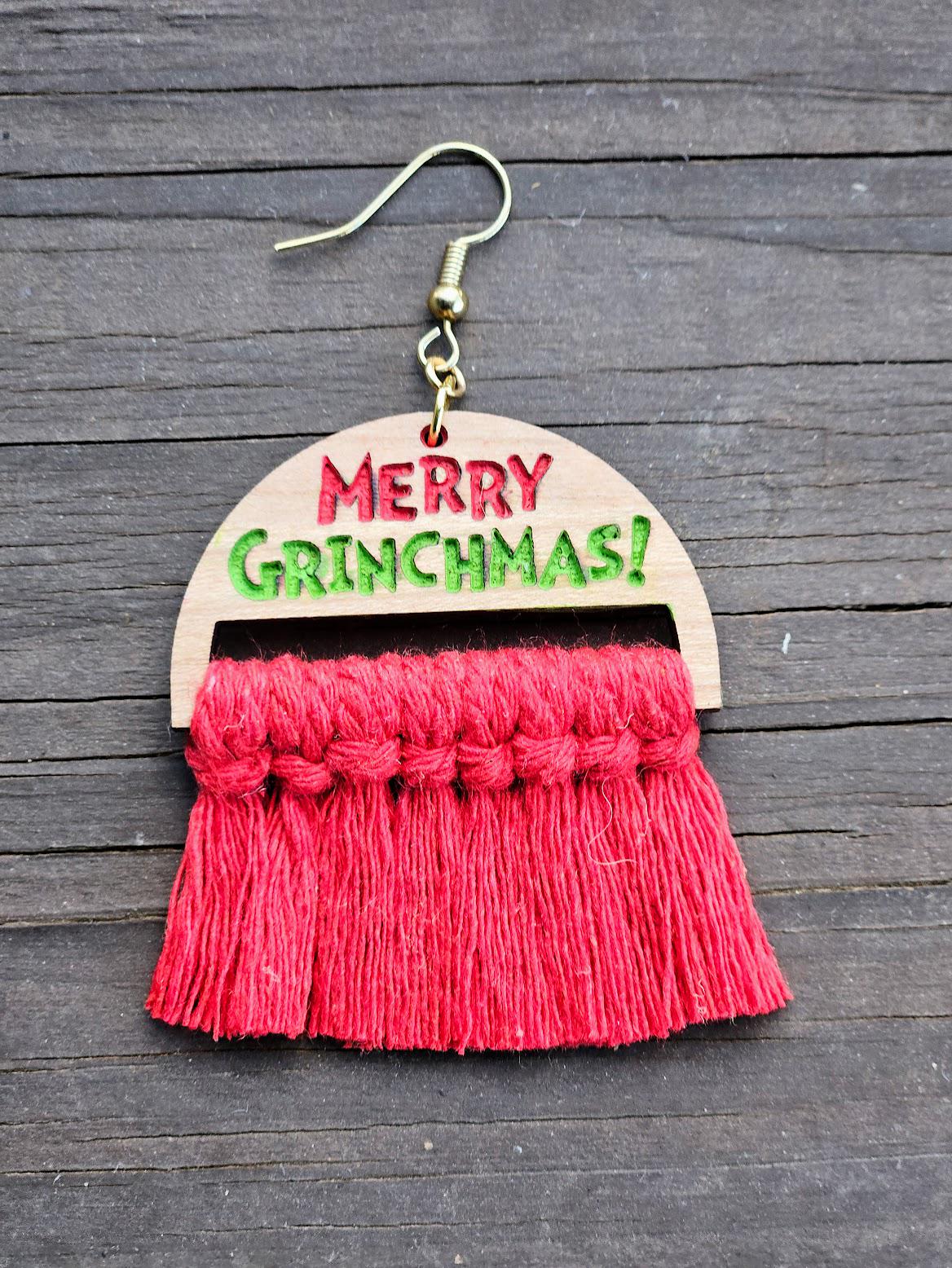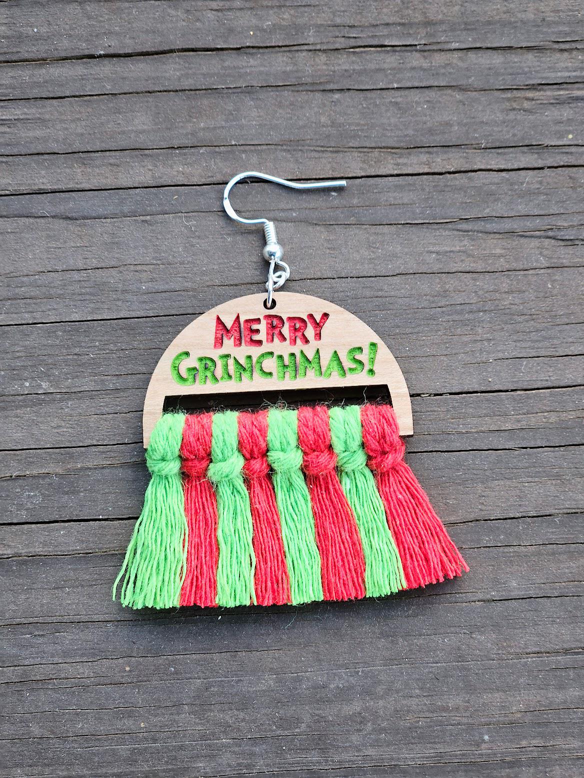 Add a touch of playful holiday spirit to your look with these **Grinch-inspired macrame earrings**! Featuring a wooden blank engraved with "Merry Grinchmas" and colorful hand-tied macrame fringe, these earrings are perfect for celebrating the season in Grinchy style. Choose from **green, red, or a festive green-and-red combo** to match your holiday vibe!
