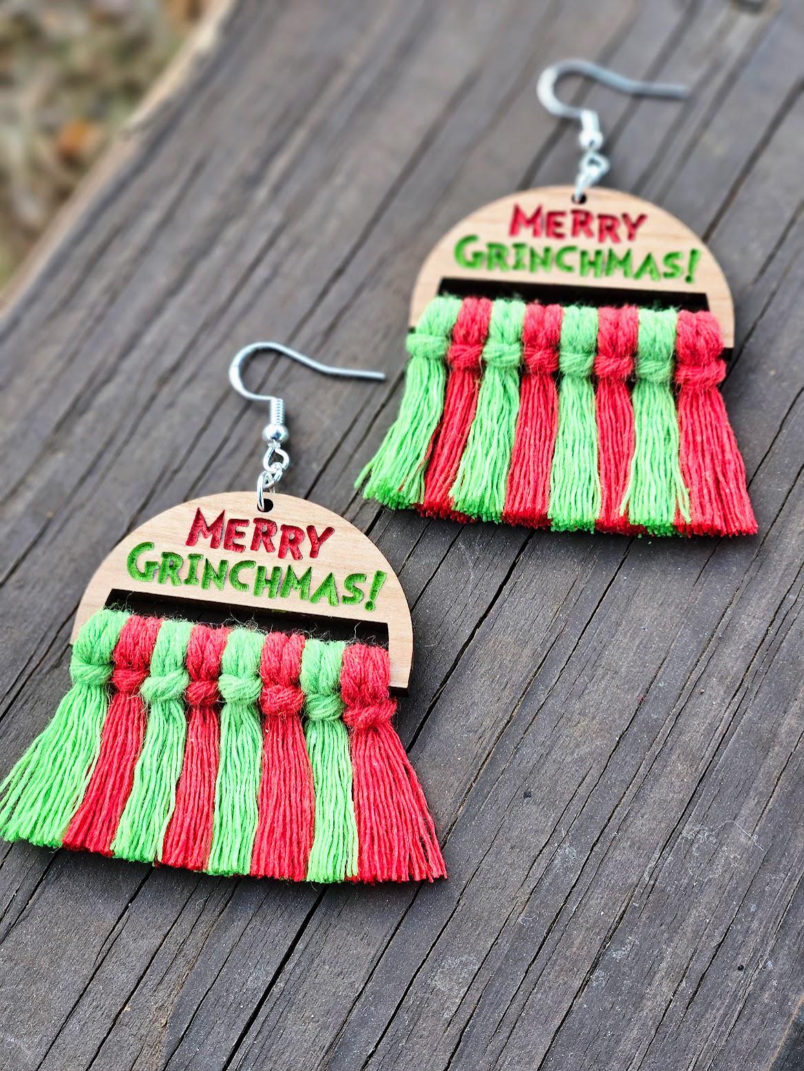 - **Material**: Wood blanks engraved with "Merry Grinchmas" and cotton macrame fringe.