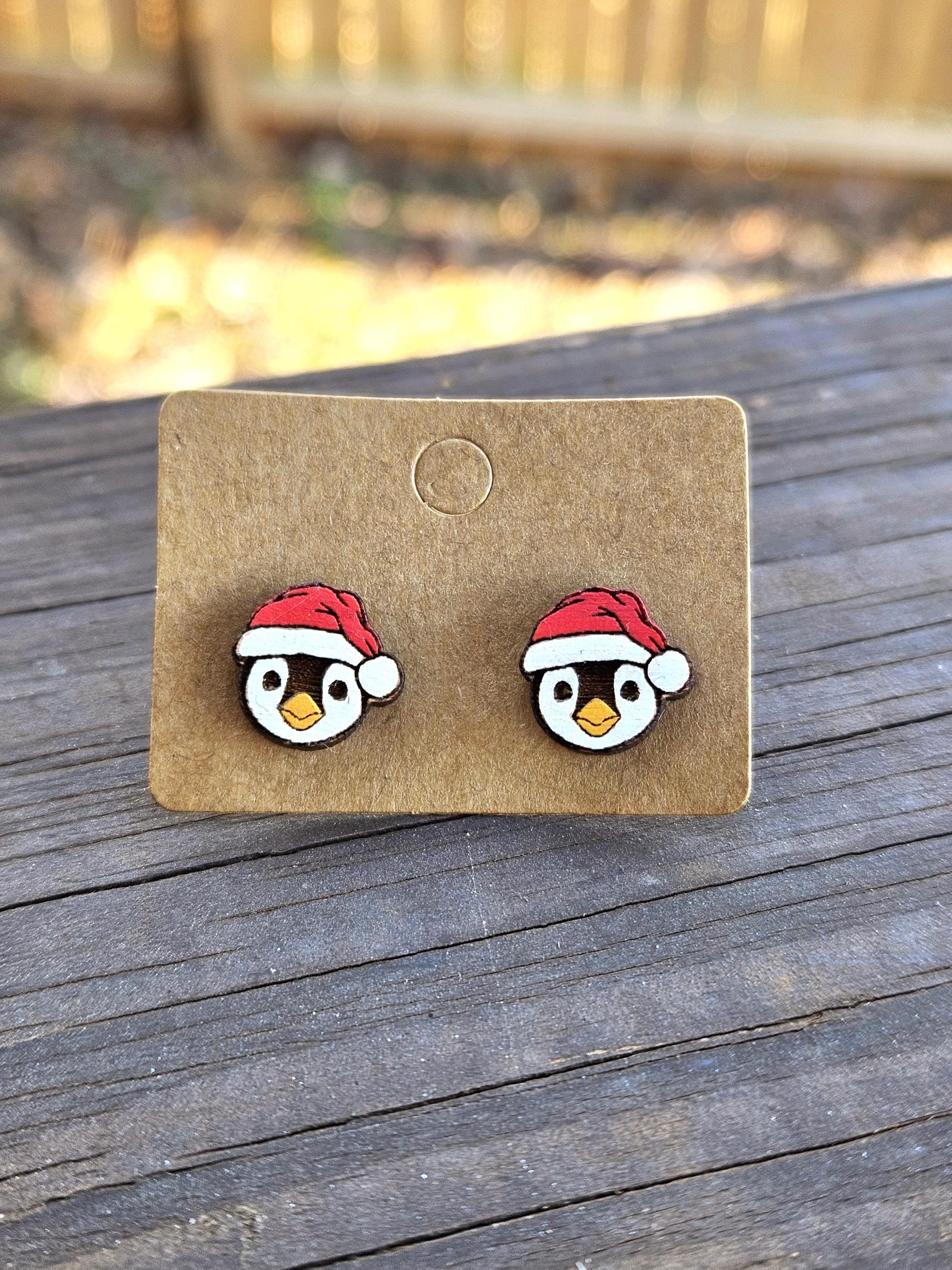 Celebrate winter with these hand-painted penguin stud earrings, each sporting a tiny Santa hat for an irresistibly cute holiday look. Perfect for penguin fans and anyone who loves whimsical seasonal jewelry.