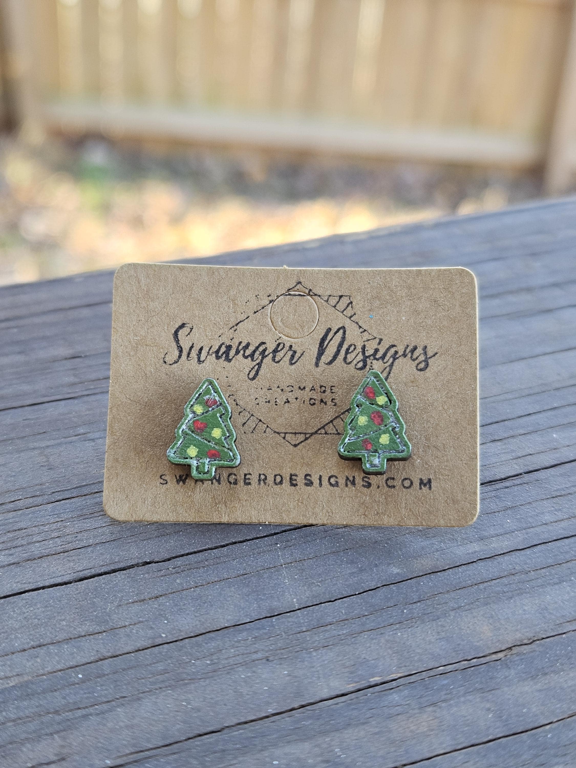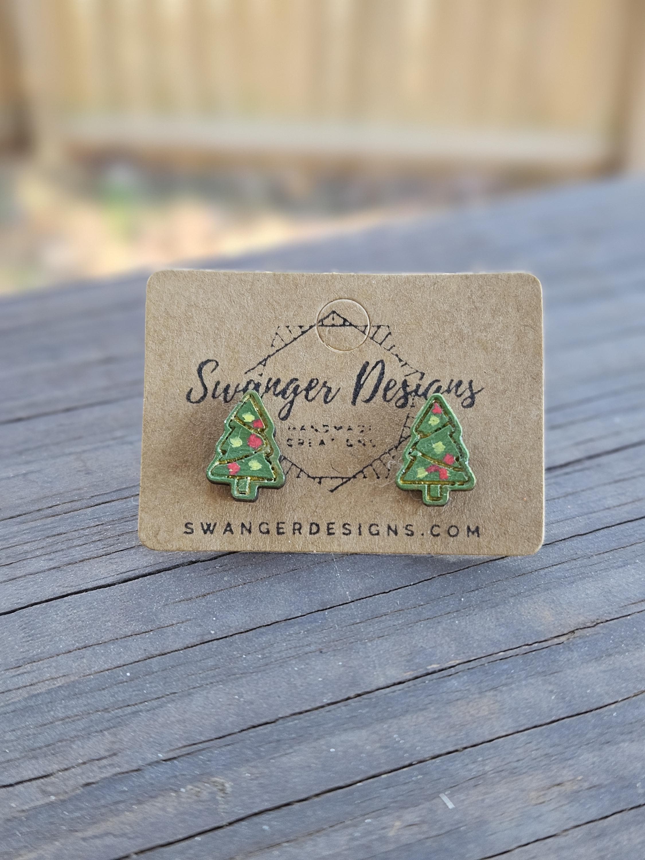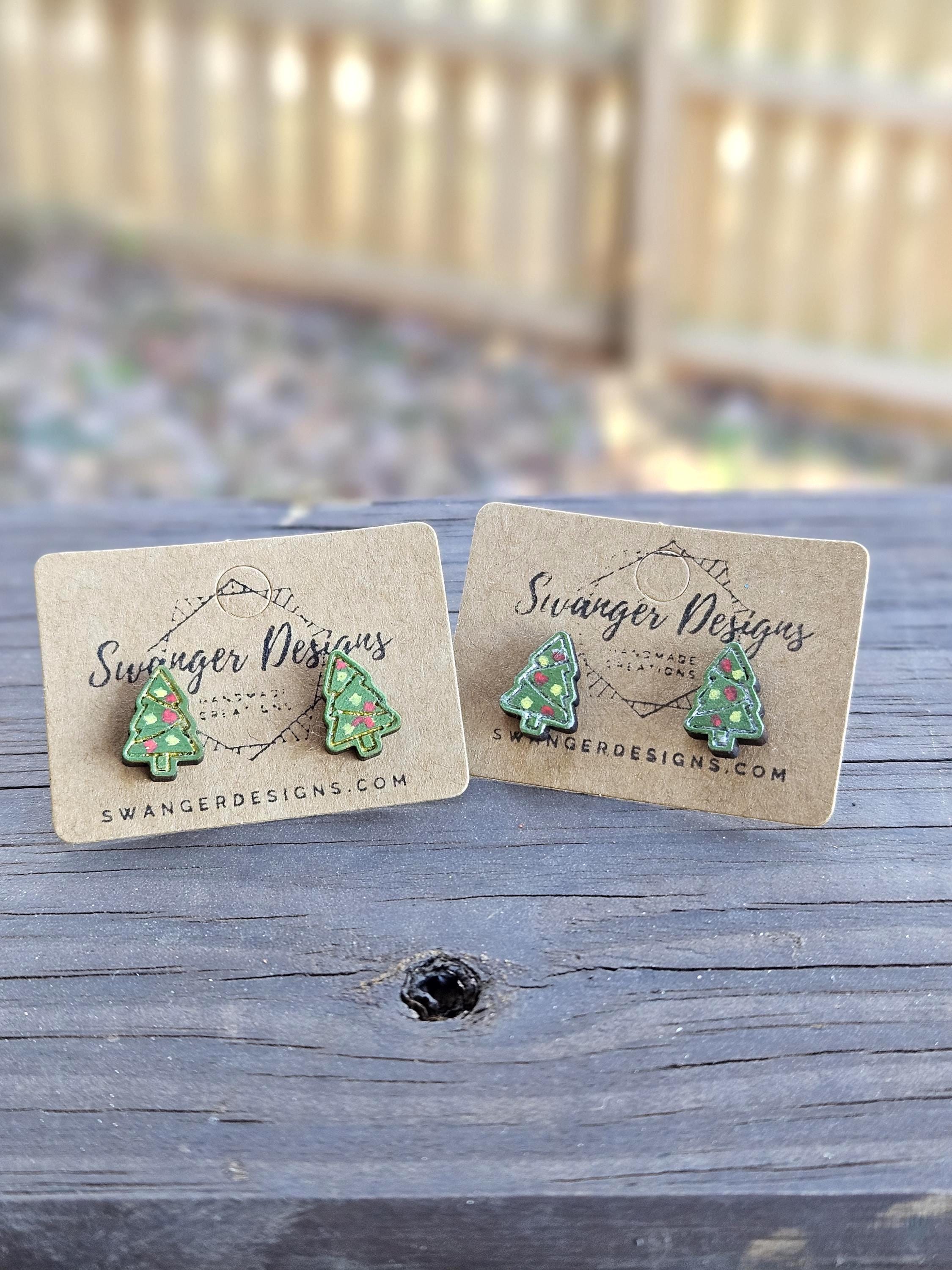 Add subtle holiday sparkle with these hand-painted green Christmas tree studs featuring your choice of silver or gold accent. Elegant and festive, they’re a polished choice for seasonal dressing.