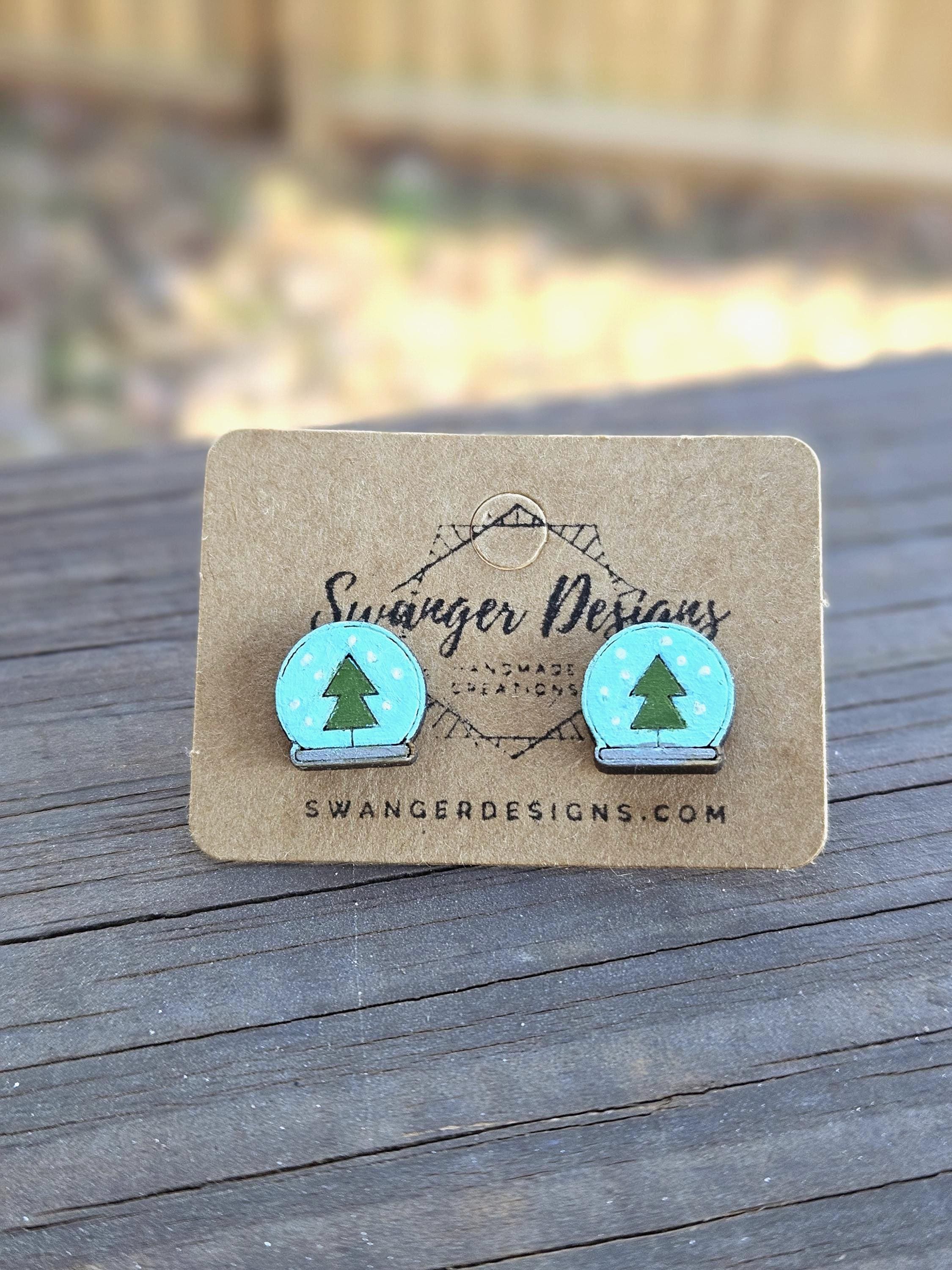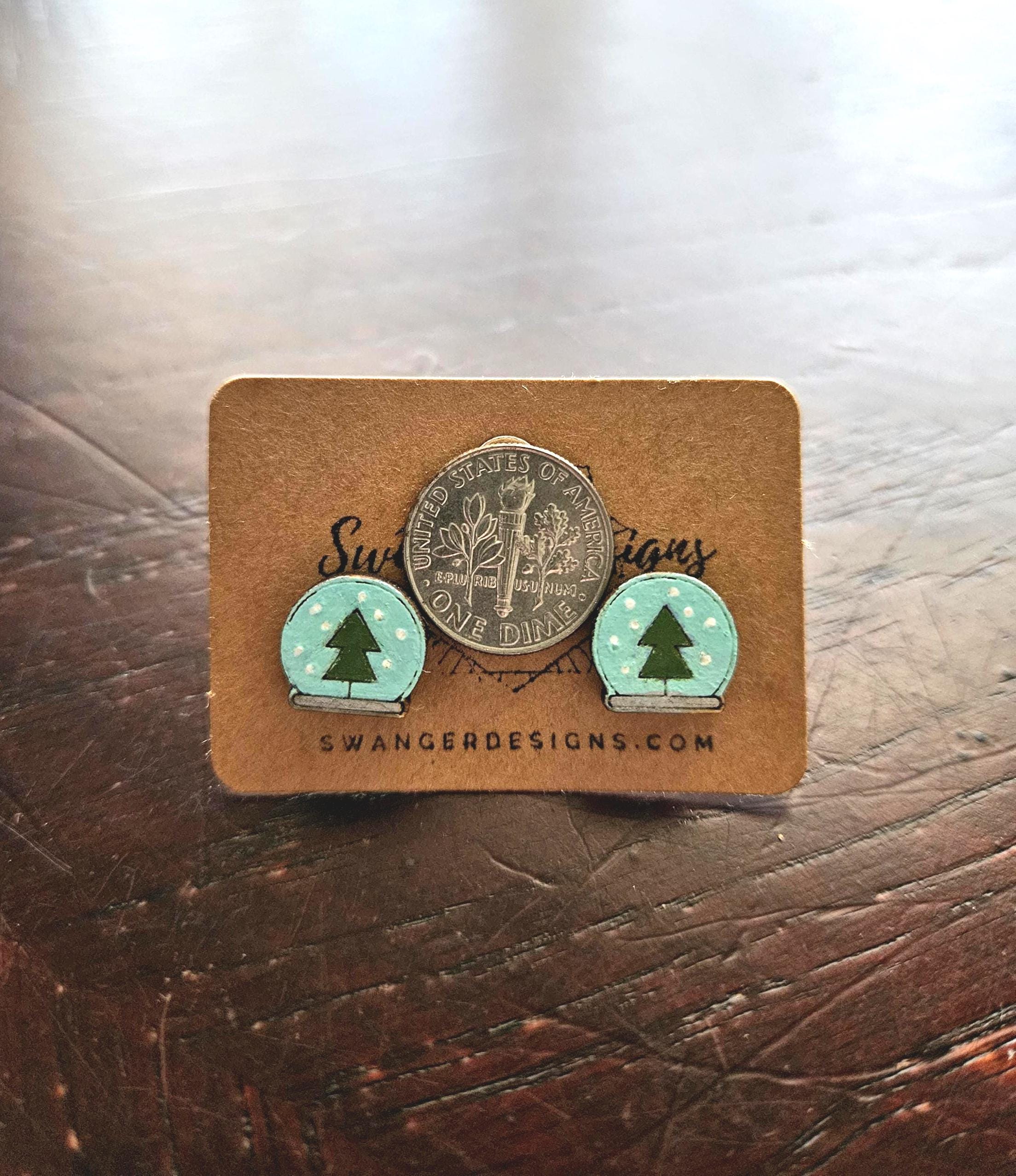 Capture a tiny winter scene with these hand-painted snowglobe studs featuring a Christmas tree, soft light-blue background, and delicate snowflakes. Nostalgic and whimsical — like wearing a miniature holiday ornament.